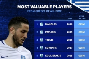 体育资讯11月16日讯 德国转会市场统计了希腊球员的历史最高身价,并列出希腊球员历史身价排名,马诺拉斯4500万欧居首,帕夫利迪斯3500万欧次席。
