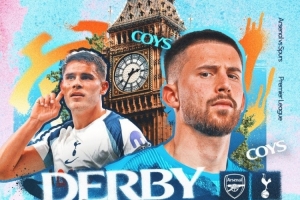 热刺官方社媒发布了为此役制作的海报,维卡里奥、范德芬、西蒙斯、特尔、帕利尼亚出镜。