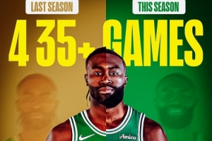 这也是本赛季布朗第四次单场得分达到35分(其中一场41分),而他上赛季一共才4次单场至少得分35分。