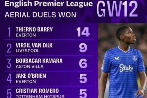 数据统计显示,巴里在本场比赛共计完成了14次成功争顶,这也是本赛季英超单场最多。作为对比,本轮英超联赛成功争顶第二多的范戴克也仅有9次。