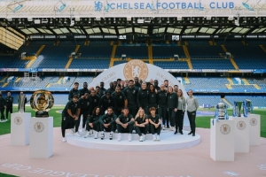 三冠王女队的成员们,包括队长米莉-布赖特,首先带着女足英超冠军奖杯、联赛杯和足总杯出场,随后整个男队带着世俱杯和欧协联奖杯加入她们。