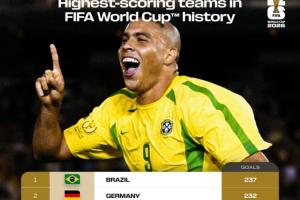 榜单上,巴西237球居首,德国232球紧随其后,巴德断档前二,阿根廷152球第3,法国136球第4,意大利128球第5,西班牙、英格兰、荷兰、乌拉圭、匈牙利前10。