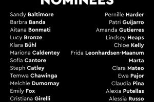 普特拉斯(巴萨/西班牙)、汉娜-汉普顿(切尔西/英格兰)、芭芭拉-班达(里昂/赞比亚)、艾米丽-福克斯(阿森纳/美国)、克拉拉-马特奥(巴黎FC/法国)