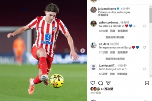 此役阿尔瓦雷斯为马竞踢满全场,但只有1次射门,赛后他在社交媒体上晒出比赛照片,配文:“抬起头来,战斗继续。”