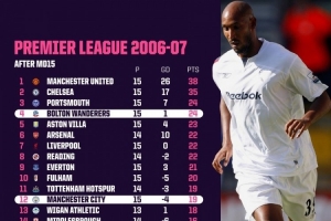 opta列出上一次英超联赛第15轮结束后,第4和第12之间的积分差距不超过5分时的积分榜。06-07赛季英超15轮过后,第4博尔顿24分,第12曼城19分,两队相差5分。