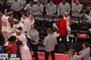 约翰逊强硬拉下麦科勒姆险些出现冲突 裁判回看后吹罚普通犯规