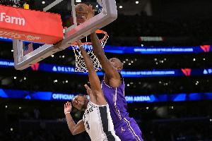 马刺的进攻思路很明确,福克斯突小里,卡斯尔莽东契奇,持球生突就能轻松杀入腹地,迫使湖人收缩协防——单刀突刺,团队分享球,空位三分扫射。