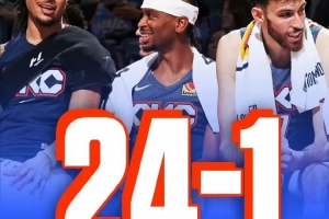 雷霆49分击溃太阳,队史最高16连胜,24胜1负开局——输的那场是背靠背,亚历山大带哈腾和三替补。