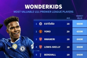体育资讯12月13日讯 德国转会市场列出了英超U21球员身价排名,埃斯特旺8000万欧居首,约罗5500万欧次席。