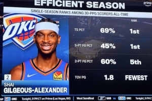 在单赛季所有场均至少30分的球员中,亚历山大真实命中率69%、三分命中率45%皆是历史第一;两分球命中率60%是历史第5,场均1.8助攻是历史最少。