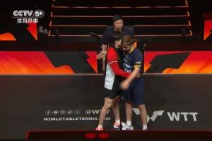 王楚钦进场与莫雷加德拥抱↓