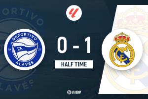 第24分钟,皇马反击机会,贝林厄姆斜传,姆巴佩左路得球,一路推进至禁区,随后起脚攻门得手,皇马1-0阿拉维斯。↓