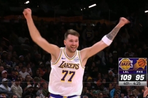 里夫斯脚踏拖鞋踩着Logo勾手命中 随后竖中指嘲讽一旁的东契奇