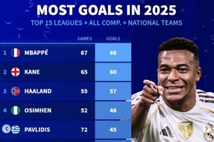 体育资讯1月2日讯 2025年已经过去,《转会市场》也统计了2025前15联赛球员的俱乐部+国家队各项赛事总进球情况,皇马前锋姆巴佩领跑。