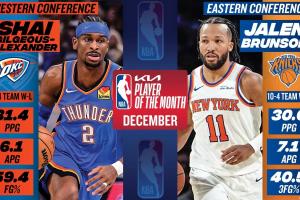 体育资讯01月03日讯 NBA官方宣布,尼克斯布伦森与雷霆亚历山大分别当选12月东西部月最佳球员。