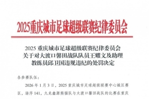 体育资讯1月4日讯 渝超联赛组委会发布罚单,对大渡口队球员王耀文禁赛5年,对大渡口队助教邱卫国禁赛4场。
