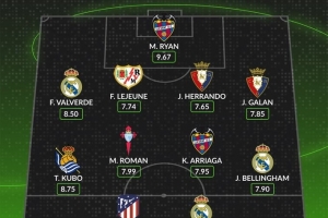 后卫:费德里科·巴尔韦德(皇家马德里,8.50分)、弗洛里安·勒热纳(巴列卡诺,7.74分)、豪尔赫·埃兰多(奥萨苏纳,7.65分)、哈维·加兰(奥萨苏纳,7.85分)