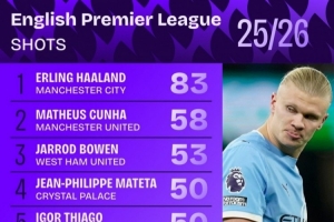 本赛季英超射门次数榜: