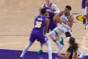 GIF-字母哥撞倒斯玛特上篮2+1,湖人挑战成功,变字母进攻犯规