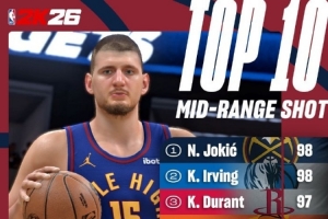 在这次的评分当中,尼科拉-约基奇和凯里-欧文的中距离均为98分,而凯文-杜兰特的中距离为97分。此外,尼克斯球员迈尔斯-麦克布莱德的中距离为96分。