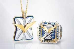 这款戒指采用采用新型材料 “蓝色陶瓷” 打造,侧面刻有队徽,戒指内侧刻有决赛比分以及各位选手的名字。