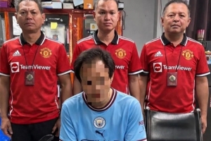 体育资讯1月22日讯 《太阳报》报道,泰国警察逮捕了一名曼城球迷,他们还穿着曼联球衣拍了他的逮捕照。