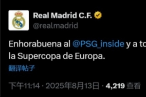 皇马官方写道:“祝贺巴黎圣日尔曼以及其所有的球迷,恭喜你们赢得实至名归的欧洲超级杯冠军。”