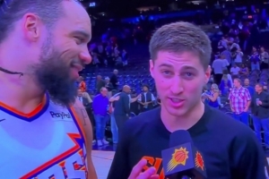 赛后采访,吉莱斯皮打断了狄龙的场边采访,同时道:“现在告诉所有人,我们队里有两个全明星。这个家伙是全明星——把你们手机都掏出来,开始投吧。”