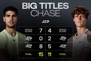 阿尔卡拉斯与辛纳重大赛事冠军数↓
