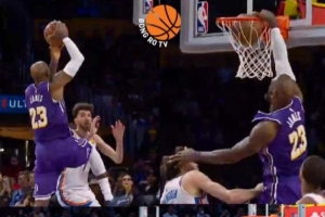勒布朗接斯玛特传球内切,特意用左手,扣了右侧补位不及的切特。