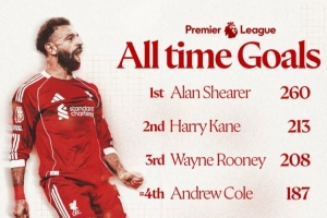 利物浦官方社媒晒出英超历史射手榜,此役过后萨拉赫的英超进球数达到187个,追平安迪-科尔并列第四。