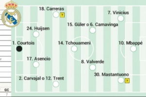 上轮停赛的维尼修斯此役回归先发,前场三人还有姆巴佩以及马斯坦托诺。右后卫位置卡瓦哈尔和阿诺德都可能在此役首发出战,中场居莱尔以及卡马文加将争夺一个先发位置。