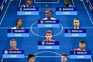 中场:普拉多斯(毕尔巴鄂竞技)、奥多贝尔(热刺)、格拉利什(埃弗顿)、卡瓦略(布伦特福德)
