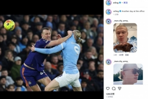 哈兰德也在赛后通过社媒晒出自己和丹·伯恩互相拉扯的贴身肉搏照,并幽默调侃:“办公室里的又一天。”