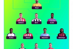 中场:库杜斯(热刺)、迪亚拉(桑德兰)、赖因德斯(曼城)、塞梅尼奥(伯恩茅斯)