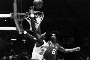 1976年J博士君临费城,之后七年,费城四进总决赛,两进东部决赛,1979年分区半决赛3比4输给冰人领衔的马刺已算最差。1983年,费城完成摩西·马龙预言的“4!4!4!”,横扫纽约,4比1破雄鹿,总决赛横扫湖人夺冠。