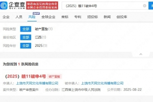 体育资讯8月22日讯 企查查APP显示,近日上饶市天同文化传播有限公司新增一起破产申请案件,申请人为该公司,经办法院为江西省上饶市中级人民法院;