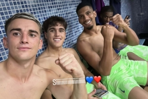 加维赛后更新社媒动态,晒出与阿劳霍、库巴西在更衣室的合照,庆祝球队取胜。