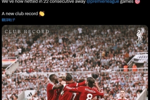 利物浦官方写道:“我们已经连续第22场在英超客场比赛中取得进球,创下了俱乐部新纪录!”