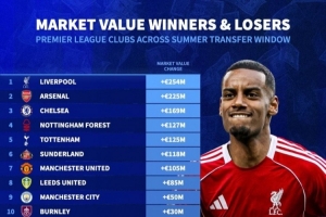 体育资讯9月4日讯 今年夏天,英超各俱乐部在单个转会窗口的转会费支出创下了纪录,高达35.9亿欧元。《转会市场》也统计了经过今夏(夏季转会窗口被定义为为6月1日至9月2日,其中包括世俱杯的临时转会窗口)的转会操作后各队的总身价变化情况,利物浦、阿森纳和切尔西分列前三,而桑德兰的身价增幅最大、达到68.4%。