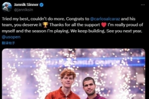 辛纳今日更新了个人社媒,写道:我已经尽力了,祝贺阿尔卡拉斯以及他的团队,你们值得获得这个冠军。感谢大家的支持,我为自己和本赛季的表现感到骄傲。我们将继续努力,明年见。