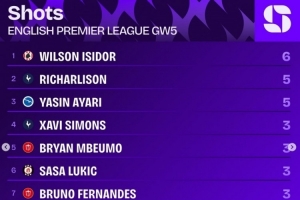 体育资讯9月24日讯 英超第5轮战罢,squawkafootball列各项数据排行,桑德兰前锋伊西多是本轮射门次数最多的球员,共6次。