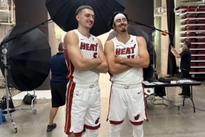 体育资讯9月30日讯 热火官方社媒晒出了媒体日上约维奇和哈克斯的合影。从照片中可以看到,哈克斯一直踮着脚,想要减少和约维奇的身高劣势。