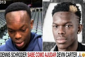 体育资讯10月16日讯 国外自媒体goatbr晒出了德文-卡特和队友施罗德的发际线对比图,并调侃到:“施罗德知道该怎么帮你。”