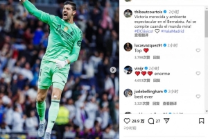 皇马门将库尔图瓦社媒晒照庆祝胜利,配文:“实至名归的胜利,伯纳乌球场的氛围震撼人心,在举世瞩目的比赛中就该有这样的表现!”