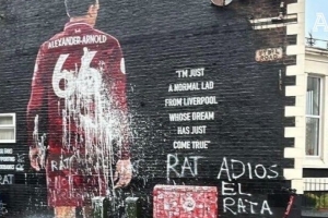 本周中的欧冠皇马将客战利物浦,阿诺德重返安菲尔德。赛前,阿诺德在利物浦当地的一处壁画遭到了球迷的污损。