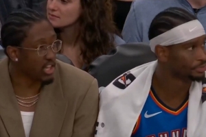 比赛最后时刻,镜头给到板凳席上的雷霆众将,亚历山大和仍在养伤的杰伦·威廉姆斯神同步。