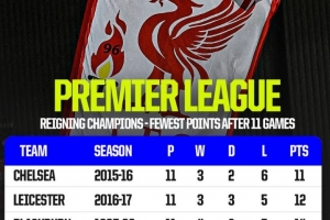 体育资讯11月10日讯 在本轮英超,利物浦0-3不敌曼城,11轮过后只得到18分,OPTA也盘点了英超历史卫冕冠军在前11轮过后最少积分情况,本赛季利物浦排在第四,具体如下: