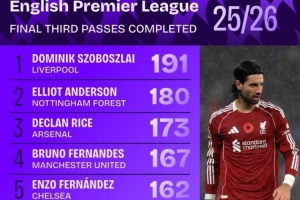 体育资讯11月11日讯 英超联赛已经进行了11轮,squakwa也统计了本赛季英超进攻三区的成功传球榜,索博斯洛伊居首。